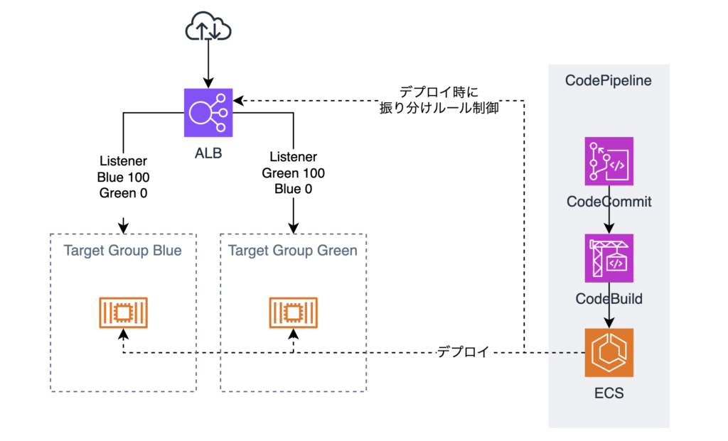 - Blue用、Green用の2つのターゲットグループに加重ルーティングする設定にしておく