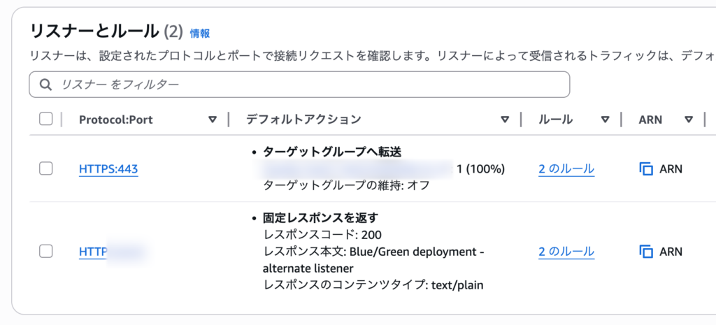 CodeDeployを利用する場合、本番稼働とテスト稼働の2つのポートを指定してリスナールールを作成していました。それぞれのリスナーで単一のターゲットグループを指定しておき、デプロイのたびにリスナーからルーティングされるターゲットグループが即座に切り替わる挙動でした。