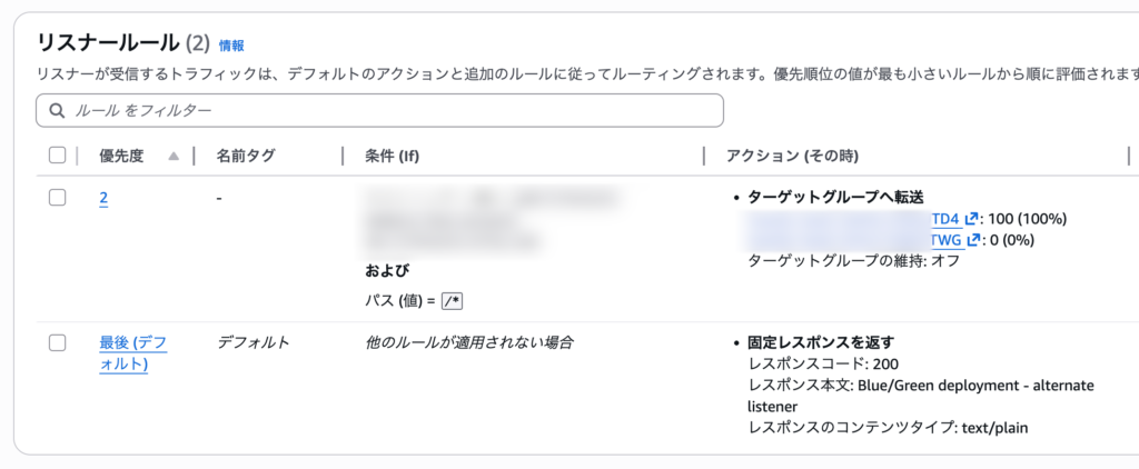 ECSのBlue/Greenデプロイでは、同じくリスナールールを2つ使うのですが、作成済みのリスナールールを使う場合、BlueとGreenのターゲットグループ両方にアクセスできるよう、加重ルーティングとして設定しておく必要があります。