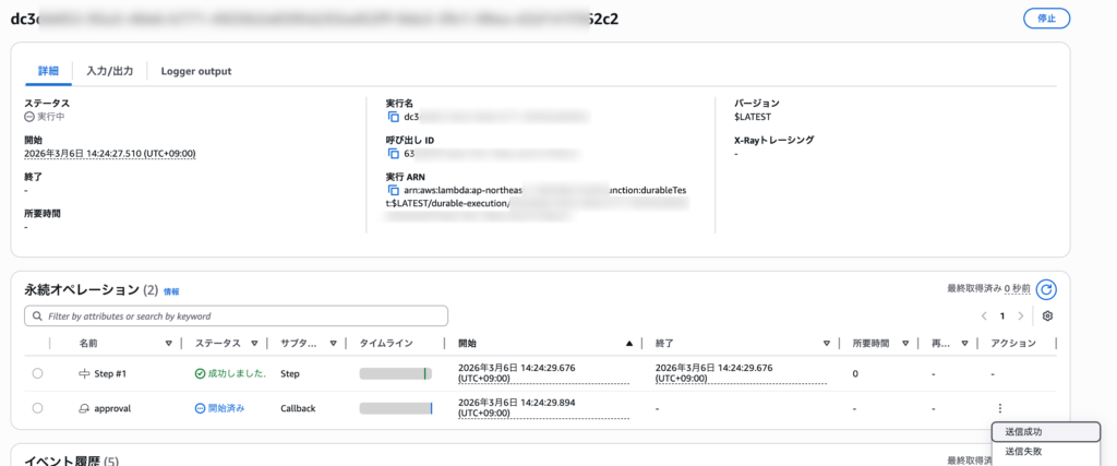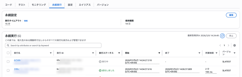 ECSのライフサイクルフックに指定してデプロイを実行すると、指定したフックのタイミングでLambdaが起動します。Durable Functionsの実行履歴はLambdaの「永続実行」タブで見ることができます。